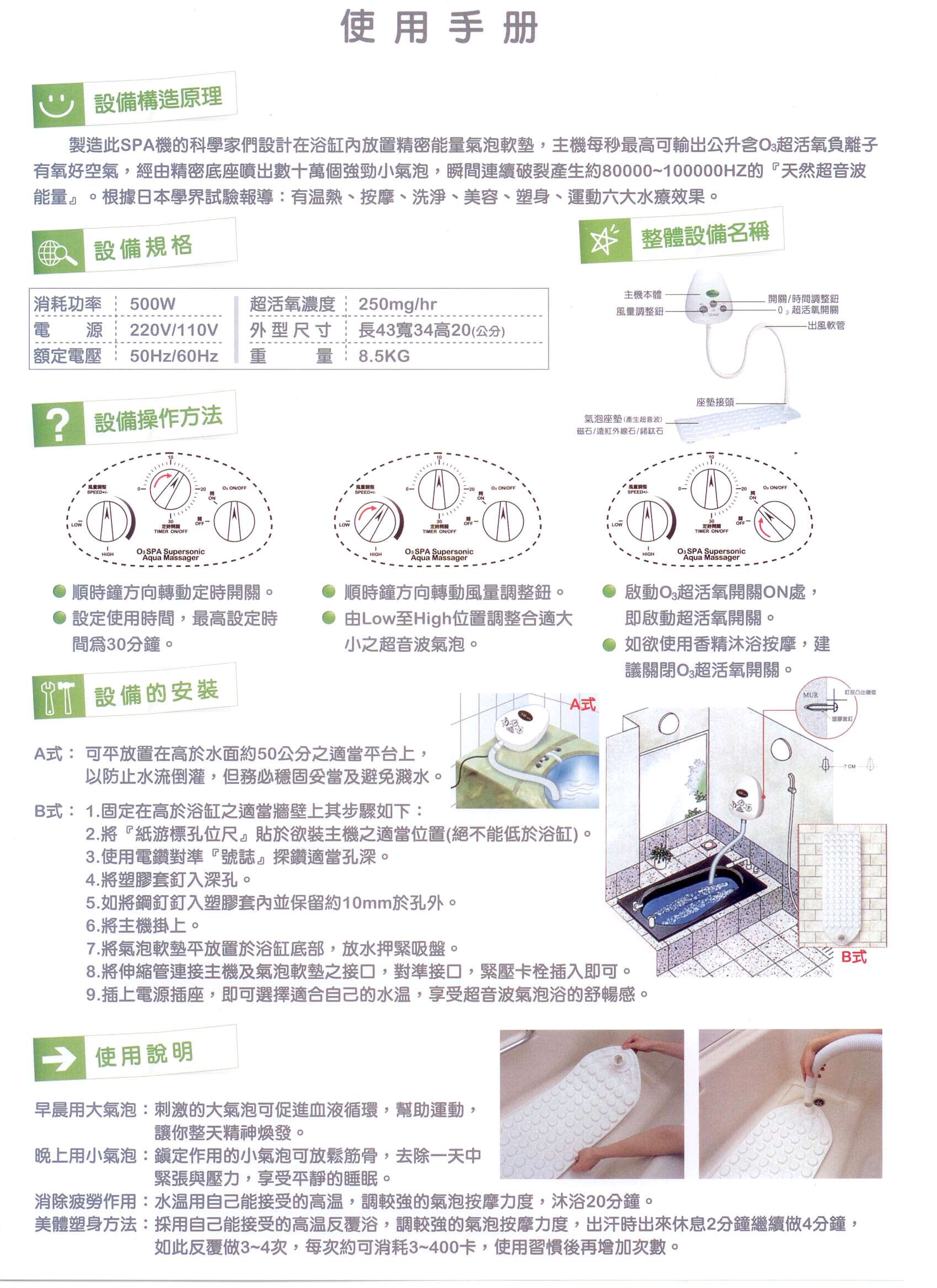 SGS 測試"臭氧"250mg/hr有效清淨水質,由超音波能量按摩氣墊輸出。 在家也能享受高級健康的SPA水療,每天享受15分鐘的沐浴相當於慢3~5公里運動量消耗400卡熱量,只要加裝磁能波動按摩浴缸設備,在愉悅的過程中就有 塑身.按摩.輔具.美容.運動.紓壓 等六大作用。 讓您 身‧心‧靈 完全放鬆紓壓。